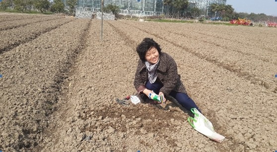 图为曹秋梅老师在她自己的一分地内播种