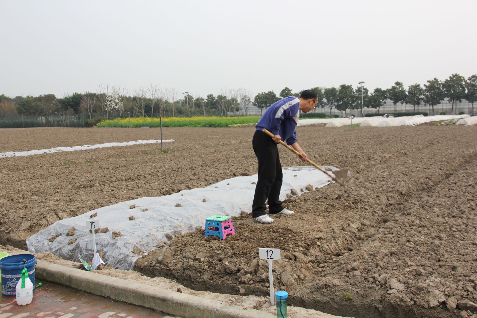 活动分三个阶段开展,第一阶段为活动准备阶段,实训基地于去年年底前就决定将位于五厍基地中心位置的5.95亩蔬菜用地平整完成,平均分成58份,每份为一垄(面积在66-70平方米间),并于3月5日前施好基础的有机肥;第二阶段是活动启动阶段,实训基地与工会一起,起草了“一分地”活动的实施操作细则、相关使用协议、文明种菜规定等并通过工会小组长会议布置、上传学院与实训基地网页等形式告知老师们;第三阶段是正式实施阶段,通过与图信中心协作运用“数字化校园”的商品订购功能,有意向的老师在3月7日下午通过网上登记生成顺序号。