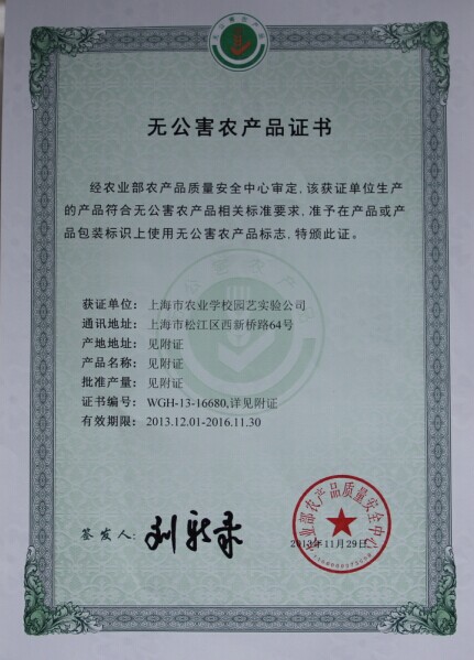 2013年5月,实训基地开始无公害农产品的申报工作。农业部无公害农产品检测中心上海分中心,全面勘察了基地周围的生产环境,化验了实训基地农业生产的土壤,灌溉用水,同时对生产的19种蔬菜,4种水果及大米共计23种农产品进行的取样检测,所有的检测结果均符合国家无公害农产品规定,同时,实训基地全面总结了23种农产品生产的栽培技术,整理了23个品种栽培中的用肥、用药的记录及所有田间生产档案,经过全面的材料准备及现场检查,23个农产品顺利通过认证,实训基地农产品生产及产品质量得到了国家的充分的肯定。