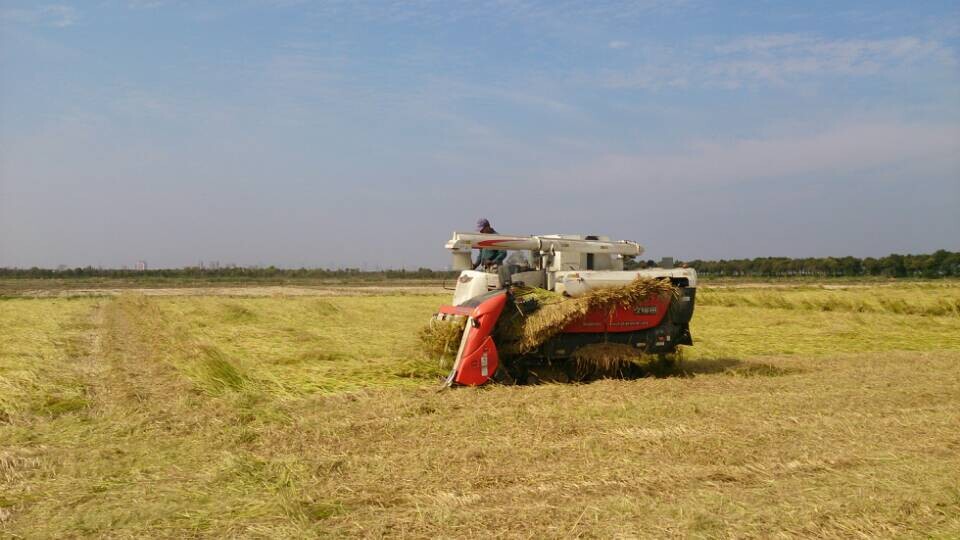 此次收割以品种及成熟时间分四次完成,但由于受台风影响,近170亩水稻大面积倒伏,久保田688收割机在收割过程中频出故障,收割过程极具困难,进度十分缓慢。