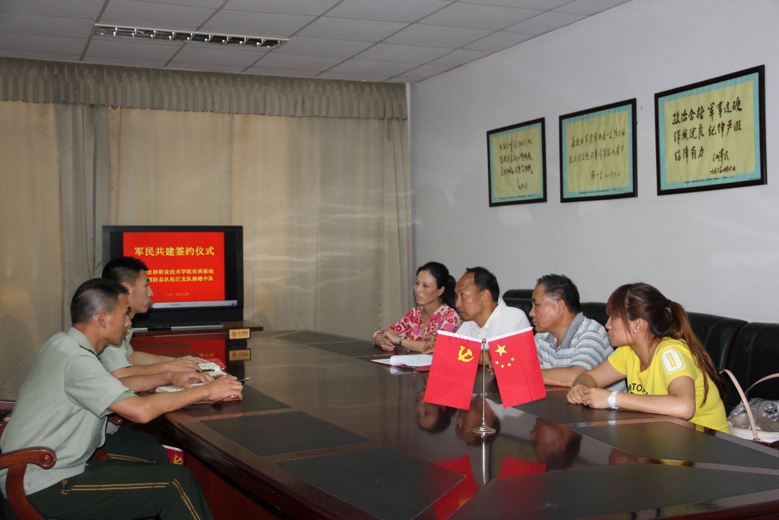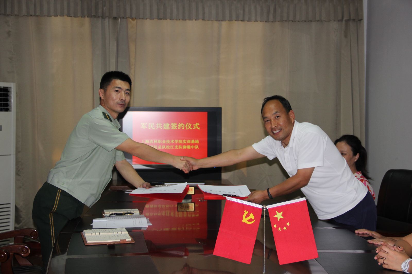 7月31日,上海农林职业技术学院实训基地与上海消防总队松江支队泖港中队举行军民共建签约仪式,双方签订了《军民共建协议书》,标志着两个单位长期缔结的友好关系掀开了新的篇章。消防中队指导员边彦军,队长梁泽高,农校副校长、实训基地主任王军亮,实训基地支部书记富剑文,实训基地支部副书记潘其云及相关同志参加了会议。会上,双方代表分别介绍了各自单位的情况,指出虽然双方的合作在签约仪式之前就已经开始,但自此以后便更是一家人,希望可以通过学校与部队的资源共享进一步做好新时期军民共建工作,巩固和发展军政军民团结,走军地融合式发展道路。