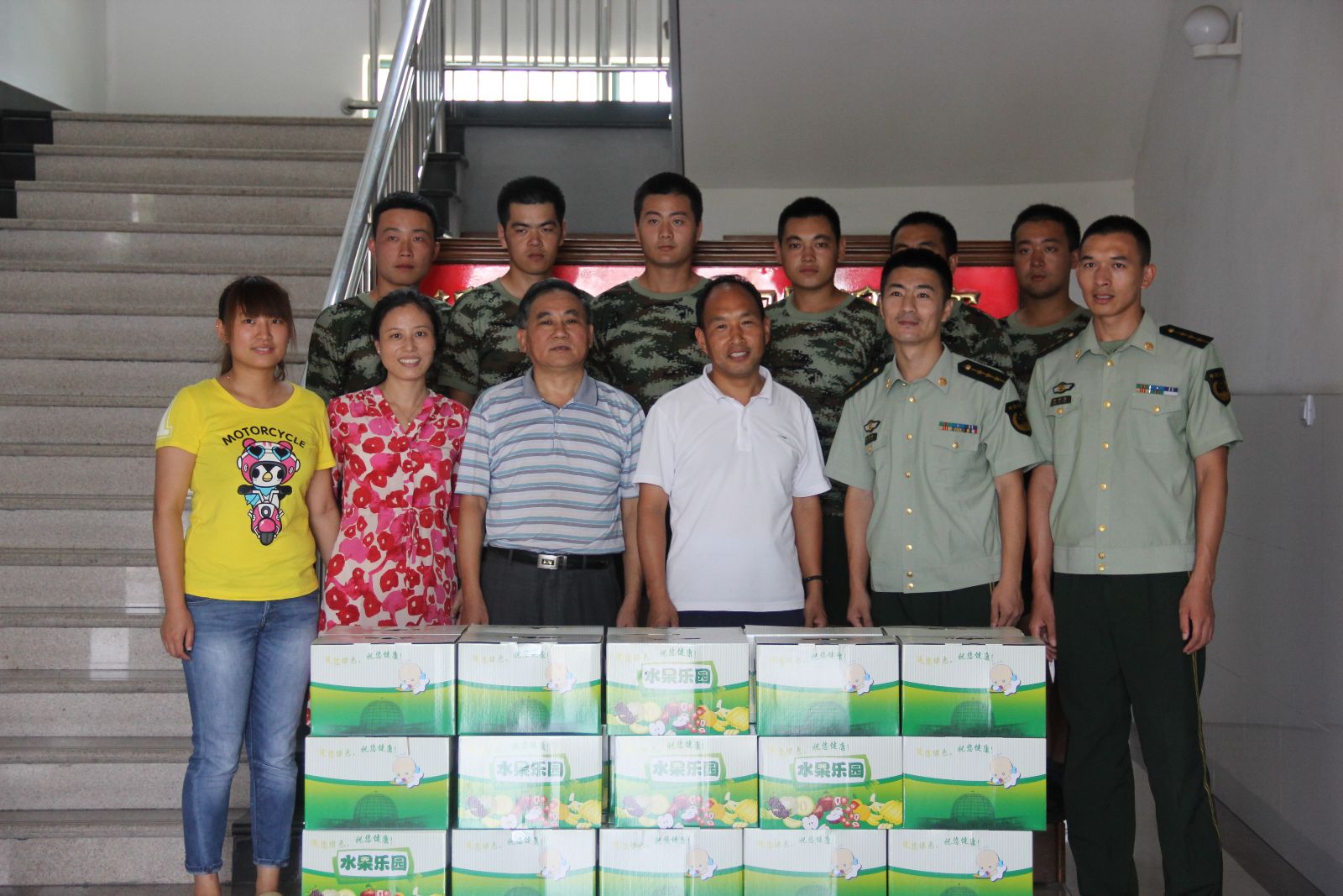 共建签约仪式的举行恰在建军节到来之际,实训基地也为在烈日炎炎下坚守岗位的消防中队官兵送去了实训基地种植的无公害水果蟠桃和水晶梨,并送上节日的问候和祝福,感谢他们长期以来为我校学生住训军事化管理工作、消防知识宣传和培训及解决生产生活困难中发挥了重要作用,做出了很大贡献,并向广大官兵的辛勤付出表示深深的敬意!