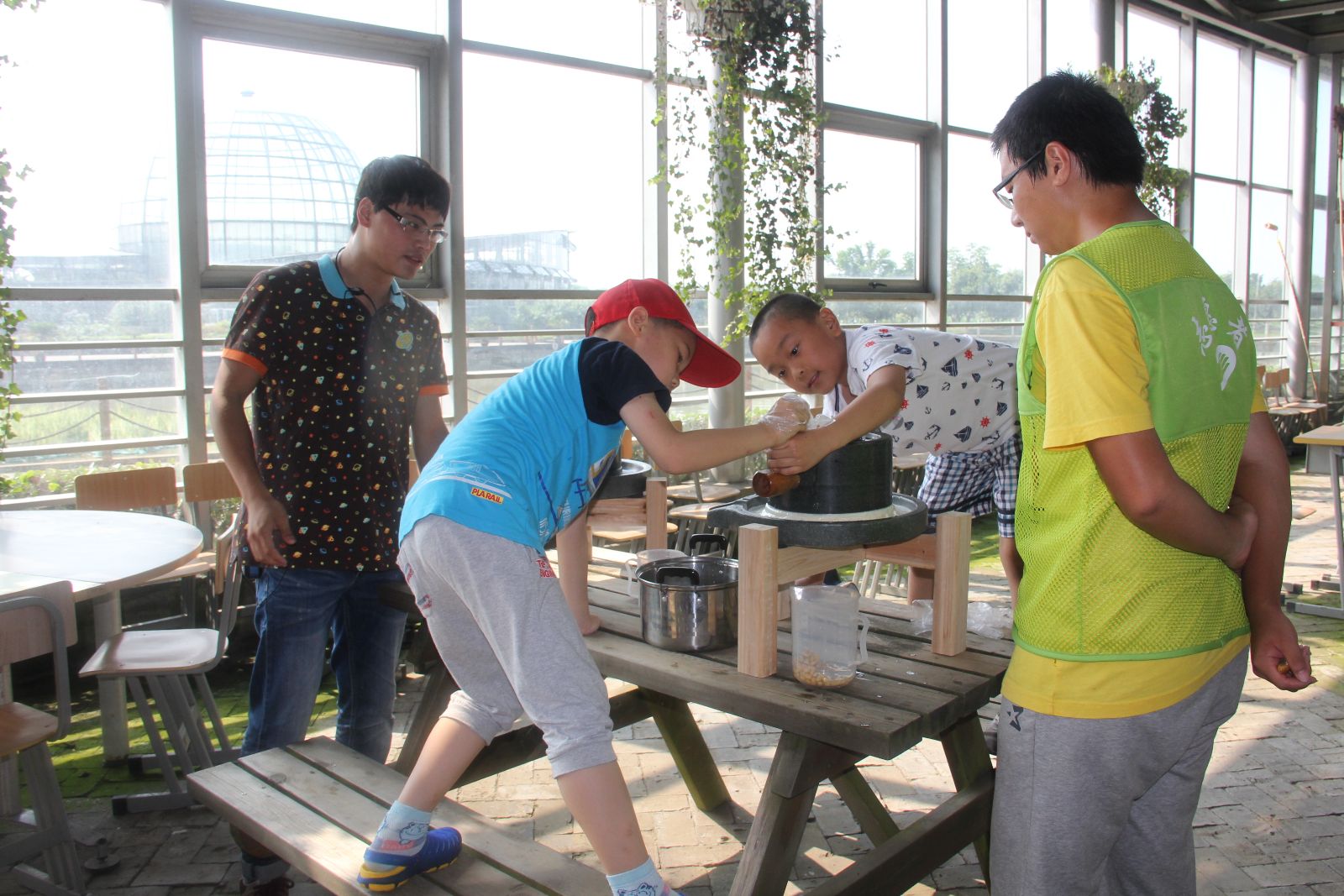 这次开放的7天中有4天气温超过38℃,大棚里更是达到了50℃。为了防止体验学生中暑,后勤保障部门为学生及家长额外提供了盐汽水和绿豆汤,特别是7月31日和8月1日两天,都是极端高温天气,为了保障学生安全,我们关闭了“神秘的植物世界”这一在温室进行的植物探秘体验项目,改为DIY水培植物,虽然很多报了此项目的学生与家长感到有点失望,但还是非常理解。