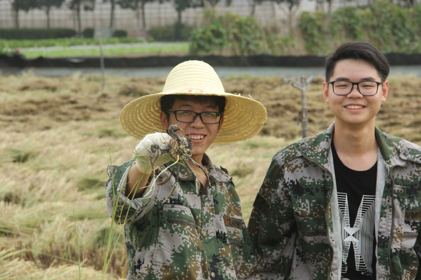 第一批的学生刚来就投入了基地水稻的收割,负责这周课程内容的是专门从事无公害和绿色农产品认证工作的杨竹莹老师。网络152班项目内容是在五厍基地进行,收割的是种养结合地块的水稻,杨老师先安排学生对机械化收割过程进行了观摩,然后由收割的实训指导员鲁浙栋为大家讲解了收割机的工作原理,最后组织学生将收割下的稻杆搬运到统一的地方。虽然秋高气爽,但习惯了在教室里静坐的学生没一会儿就腰酸背疼,汗流浃背,纷纷放慢了节奏。不知道谁大喊了一声“有螃蟹!”,大家一股脑儿全围过来了,个个兴奋得忘记了劳累,都想将它抓进自己手里,受了惊吓的螃蟹横着八条腿拼了命地逃,但也无法逃脱被抓的命运。