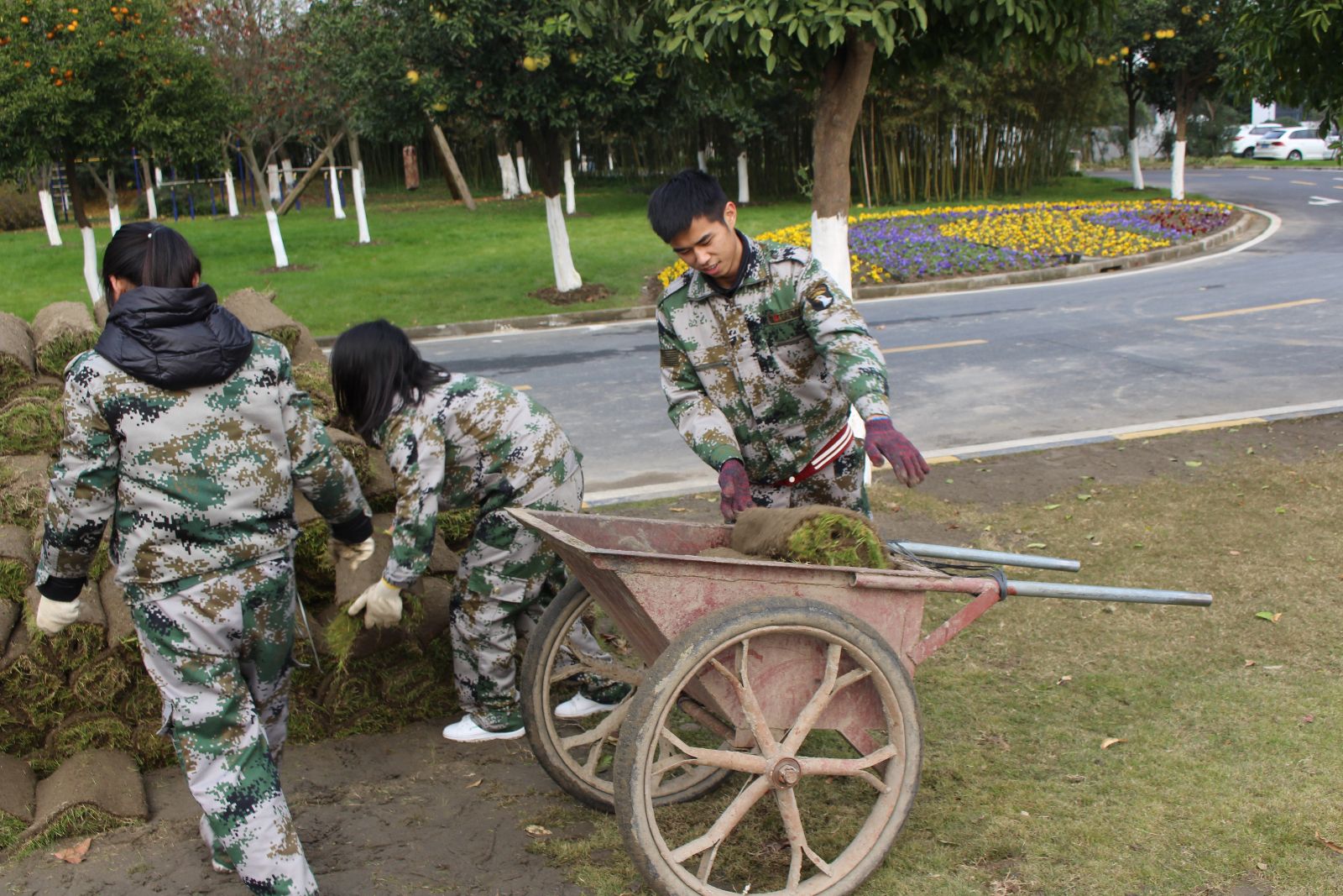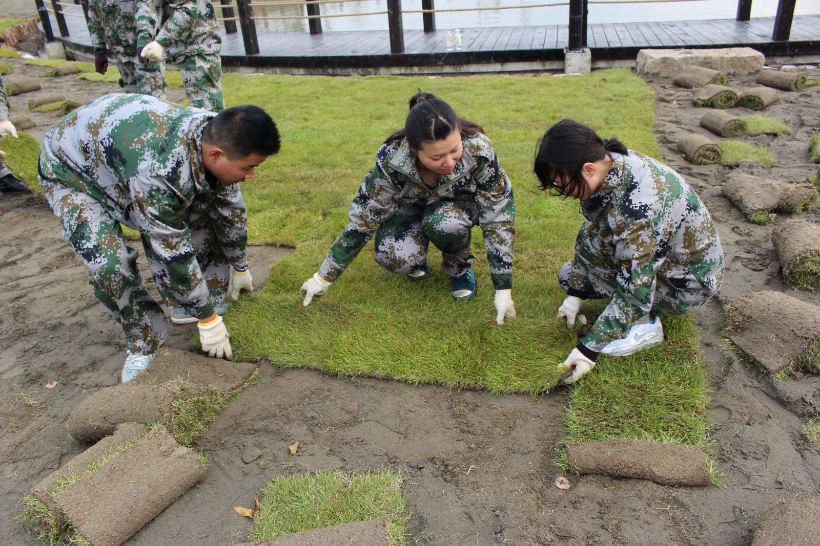一场雨后,天气渐寒。五厍实训基地的草坪由于施工等原因受到损坏,为了保护好草坪植被、防止草坪水土流失,基地采取了紧急补救措施—铺草皮。