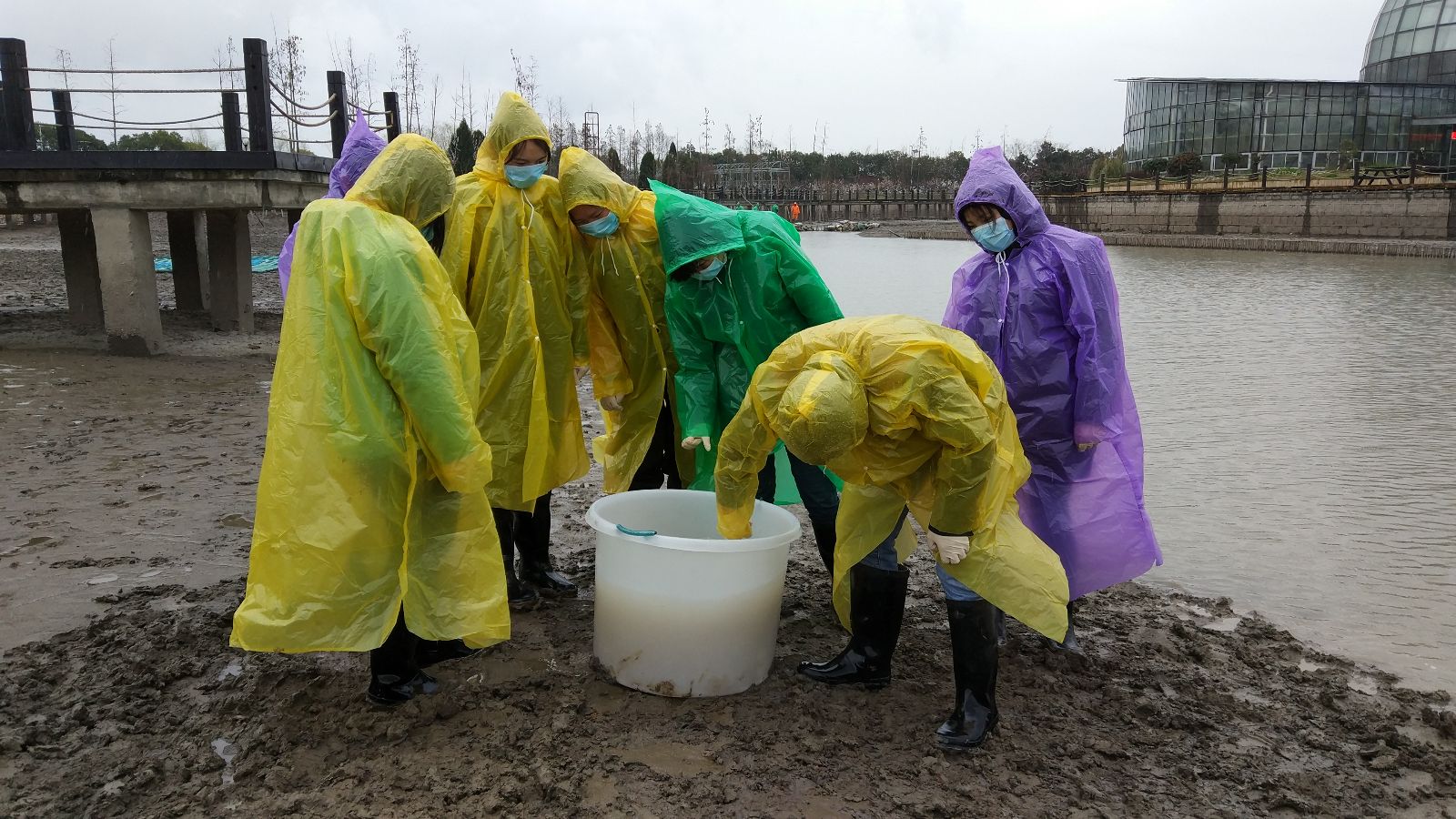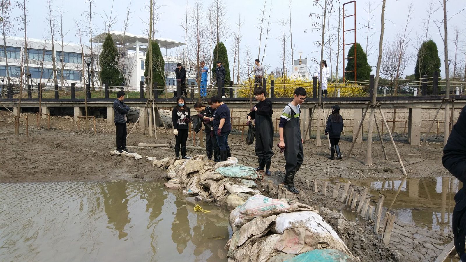 拣拾鱼塘里的石块和垃圾