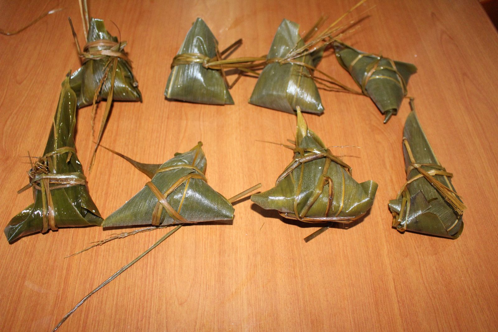 开始动手之前,同学们已按班级分为六个组,每个组配备了一名经验丰富的食堂阿姨指导。开始动手了,首先,拿出两片一大一小的粽叶,同学们学着食堂阿姨的样子将粽叶折出了一个圆锥型的角桶,在折好的角桶里放入一点已经浸泡好的糯米,在放上一颗蜜枣或是一块咸的五花肉,再用糯米铺盖严实,似乎大家把包粽子想的太过简单了,比想象中简单的就完成了一大半,殊不知,当把粽叶盖上时,糯米竟像个顽皮的孩子似的,一粒粒接二连三的滚落出来,同学们急的像热锅上的蚂蚁团团转,幸好有食堂阿姨在,帮同学们解了围,拿掉一些糯米,再重新包裹。食堂的阿姨告诉同学们,馅料不能太多,也不能太少,必须刚刚好才行。