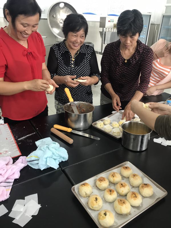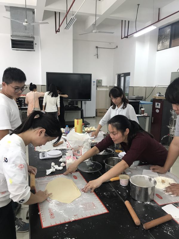 活动邀请了茹塘村的两位烘焙爱好者在基地生物技术实训室教大家手工自制月饼。师傅教得细致徒弟学得认真,从制作手法到什么时候加面粉、水、油以及加多少,她们都手把手地教会每个参加人员。从和面擀皮、和馅、包月饼、烘焙到最后成功出炉,现场洋溢着欢乐祥和的气氛。