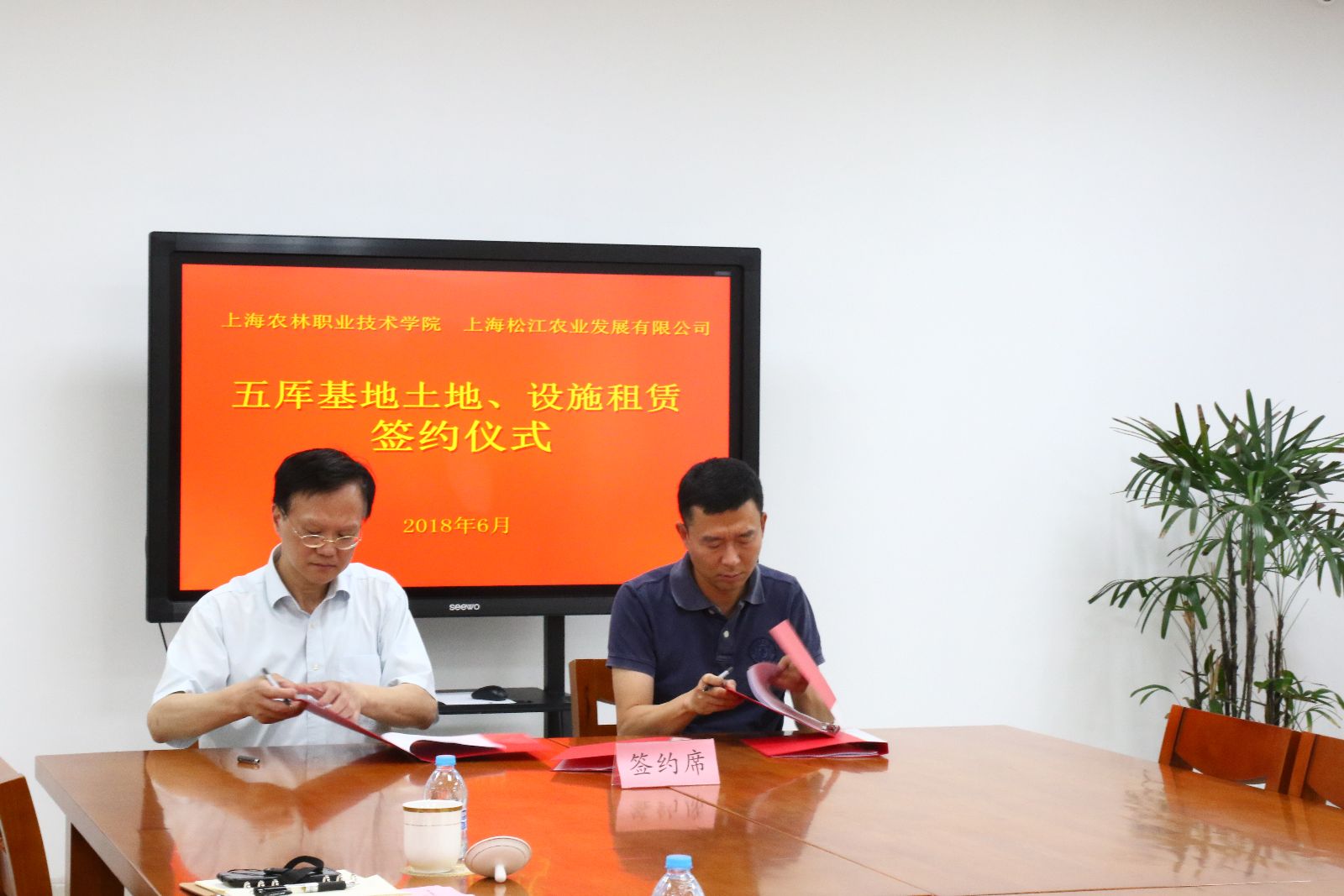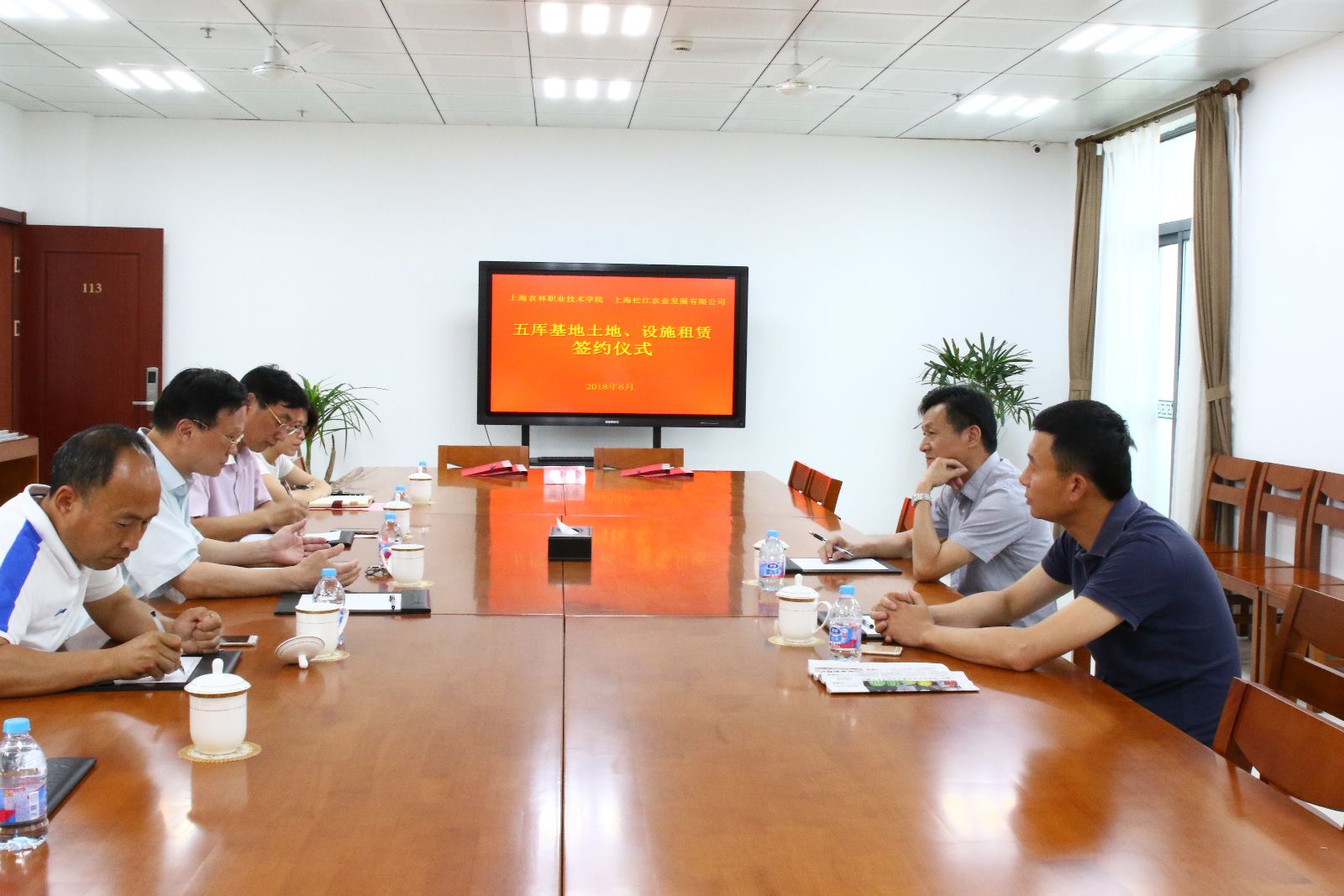 6月14日下午,在五厍基地,学院与上海松江农业发展有限公司举行五厍基地土地、设施租赁签约仪式。松江区农业委员会党委书记、主任周留昌、上海松江农业发展有限公司总经理徐霖、学院党委副书记、院长魏华,党委副书记、副院长俞锦禄,市农校副校长王军亮等出席签约仪式。