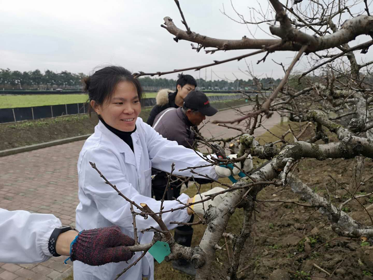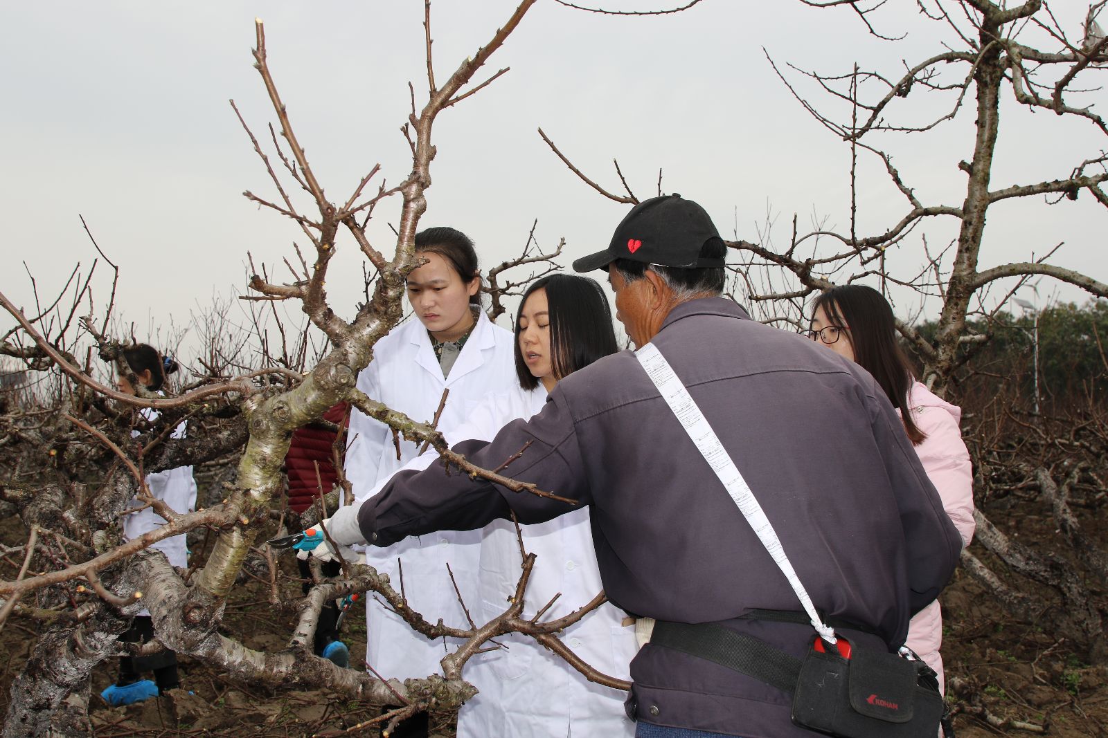 此次修剪工作全部由基地教职工自行完成,大家来自不同岗位,有双创教官、实验员、实训指导教师等,大多数人从来没有接触过果树修剪,大家在师傅教授下边学边看边摸索,不断练习。共完成160余棵桃树和200余棵梨树的修剪工作。