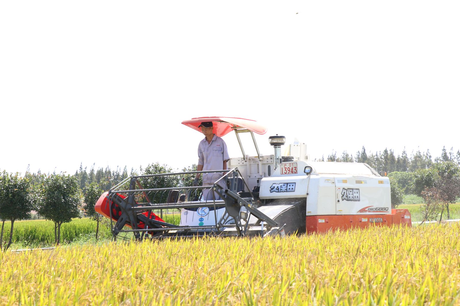 9月18日,奉贤海湾基地,稻田一片金黄,随着两台收割机缓缓驶向稻田,拉开今年水稻收割的序幕。