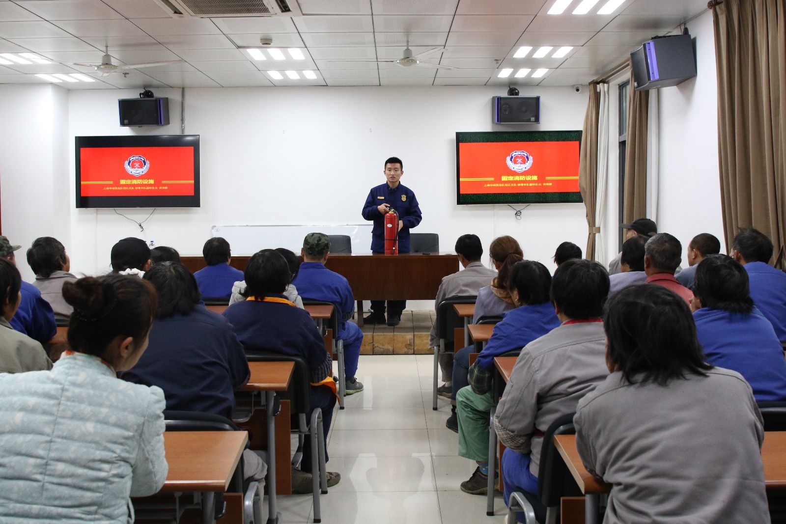 消防官兵从《固定消防设施》的定义和种类入手,结合图像,对固定消防设施在灭火救援现场应用现状进行了分析,列举了实训基地场所不同类型固定消防设施在灭火救援现场的不同用处,强调了固定消防设施在灭火救援中的重要性。随后,参训员工分两组进行灭火训练,大家沉着冷静,反应敏捷,做到正确使用灭火器材,真正达到人人了解安全消防知识、各个会用消防器材的目的。