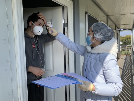 对于外省返沪人员进行14天的居家隔离,建立微信聊天群,要求在家隔离人员每天测温上报,并询问生活方面的需求,根据需求给予帮助,比如配送蔬菜、鸡蛋等。在实训基地居住人员进行一人一间式居家隔离,由工作人员进行每天三餐配送及体温测量。