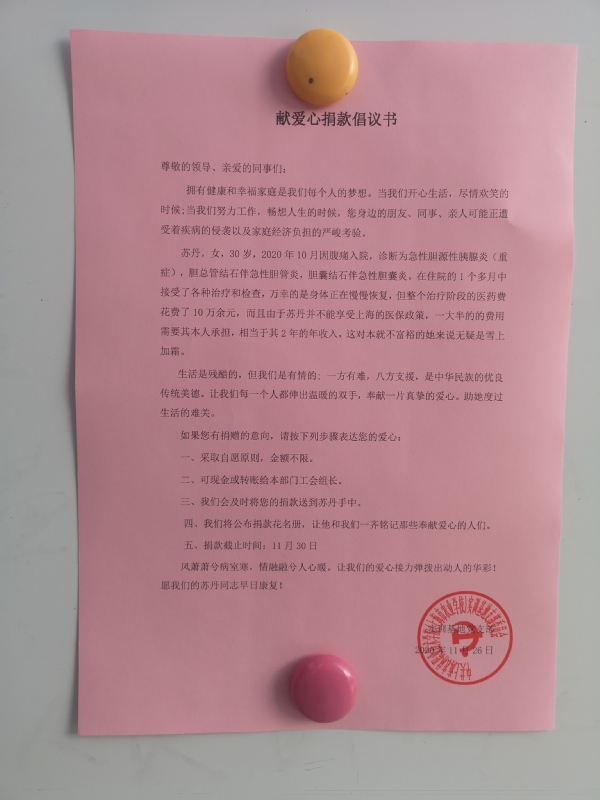 据悉,该名同志于十月初因腹痛入院,诊断为急性胆源性胰腺炎(重症),胆总管结石伴急性胆管炎,胆囊结石伴急性胆囊炎。在住院的1个多月中接受了各种治疗和检查,前后共计花费近10万元,所幸的是治疗比较顺利,身体正在慢慢恢复。但该同志因不能享受上海的医保政策,一大半的的费用需要其本人承担,相当于其2年的年收入,这对本就不富裕的她来说无疑是雪上加霜。