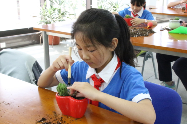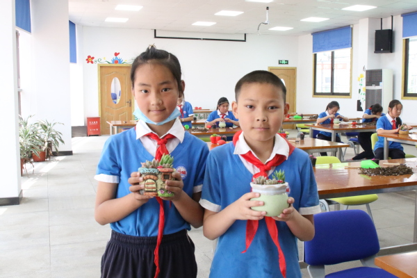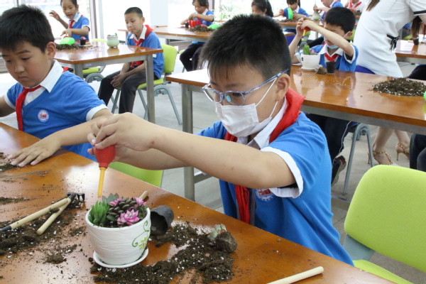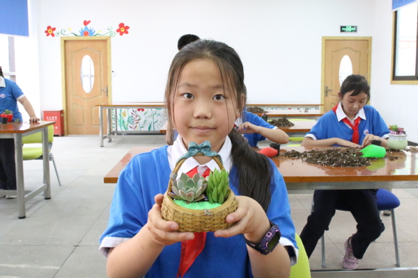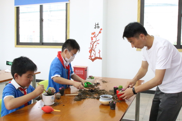 线下职业体验项目为“多肉植物栽培DIY”,项目指导老师向同学们讲解多肉植物的品种、多肉植物的种植方法、多肉植物的养护方法等,同学们自己选取喜欢的多肉品种、挑选花盆容器,将营养土用工具装入花盆内,将多肉植物以自己喜欢的样式移栽至营养土内,学生忙的不亦乐乎。伴着欢声笑语,一盆盆可爱的多肉组合盆栽完成,学生们捧着自己制作的盆栽,脸上洋溢着满意的笑容!