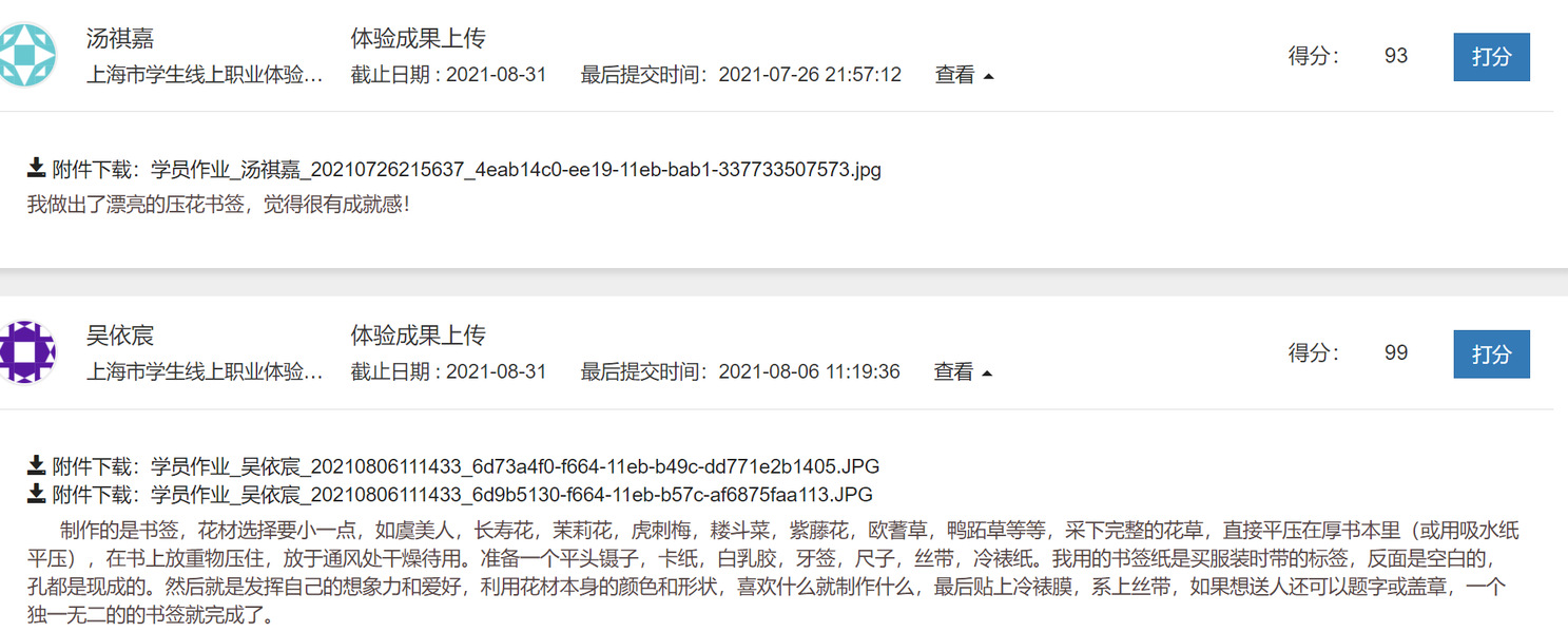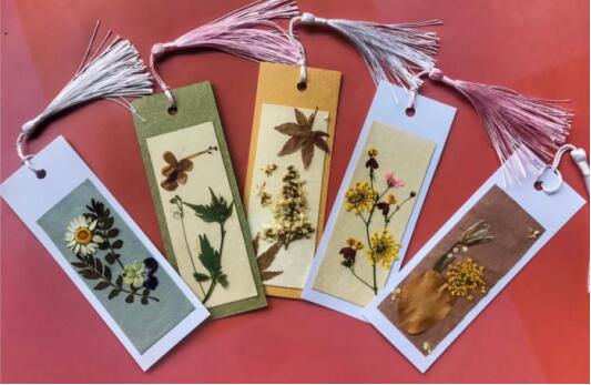 压花书签制作主要通过压花工艺再现植物的生机与风采赋予它新的生命,用压制干燥的花材作为创作的基本材料,依其形态、色彩和质感设计制作成具有观赏性和实用性的书签作品,给平凡的生活添加绚烂的色彩。该项目自开展以来,深受同学们的喜爱,本次线上体验共有100名同学报名参加,其中51名同学上传了作品并留言参与线上项目的感悟。
