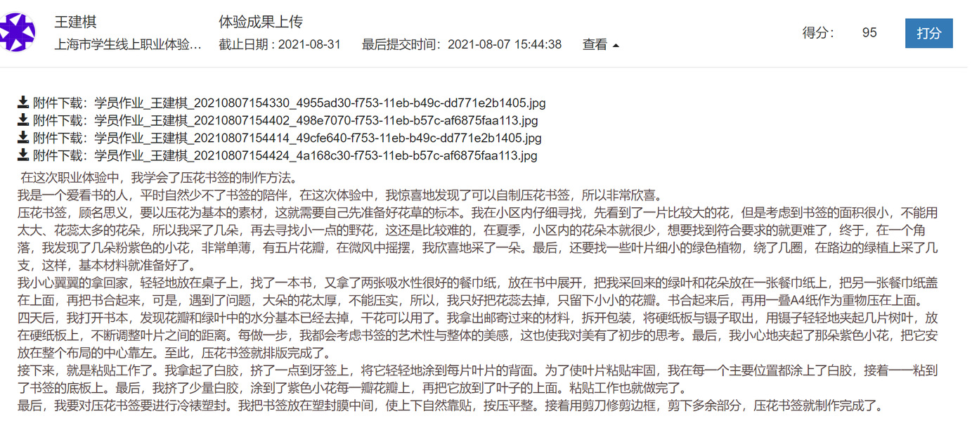 为贯彻落实《关于全面加强新时代大中小学劳动教育的意见《国家职业教育改革实施方案》和《上海职业教育高质量发展动计划(2019—2022年)》等文件精神,做好疫情防控常态化背景下的本市中小学生职业体验工作,进一步促进普职融通,加强劳动教育,实训基地按照上海市教委教育技术装备中心的相关要求,于7月10日至8月31日顺利开展了暑期线上职业体验项目“压花书签制作”。