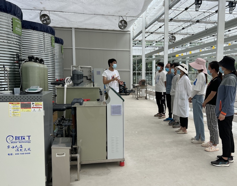 首先,实训基地智慧农业生产指导教师杨平为大家介绍了我国“植物工厂”的发展现状和无土栽培技术与传统农业的发展优势,并为大家演示了“半封闭植物工厂”内可升降的悬挂式无土栽培系统和水肥一体化精准灌溉施肥系统的操作技术。