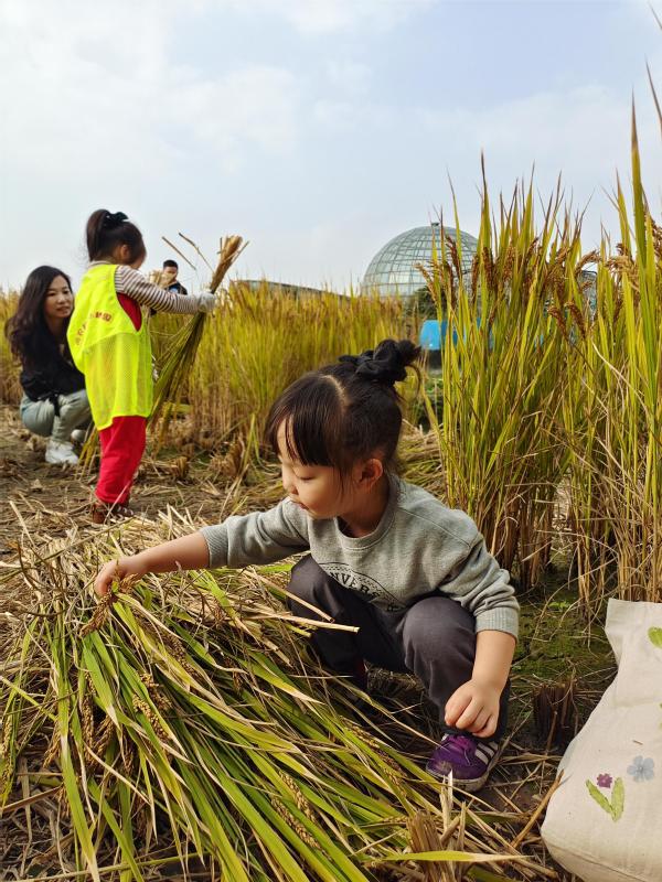 11月26日上午,来自西外幼儿园中六班的20余名小朋友来到基地,和爸爸妈妈一起体验了传统割稻、稻谷变大米等传统秋收项目,在体验秋收的同时,还利用秸秆、叶片等剩余原料,制作了属于自己的DIY稻草人和帆布包。
