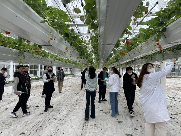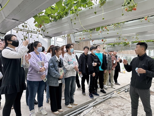 最后,全体同学来到半封闭植物工厂,专业教师杨平为同学们介绍了国内半封闭植物工厂的发展现状、无土栽培的优点以及草莓植株性状、花果管理技术。同学们动手参与了草莓的疏花疏果及畸形果的摘除,并对草莓果实进行了品鉴。