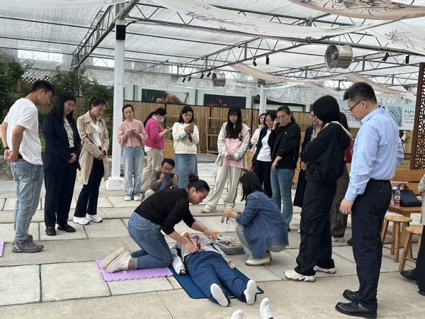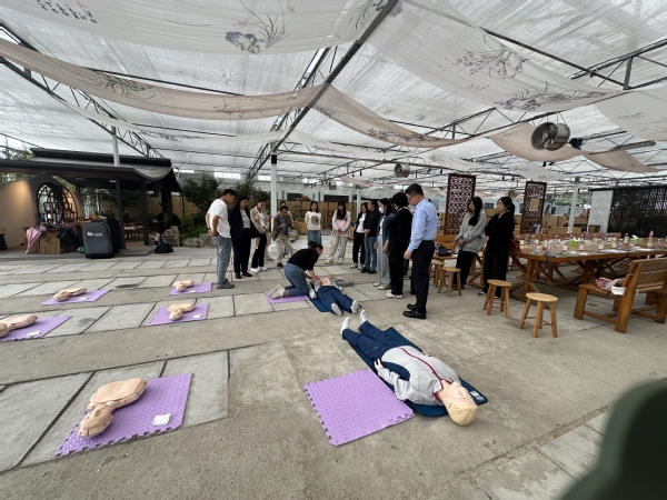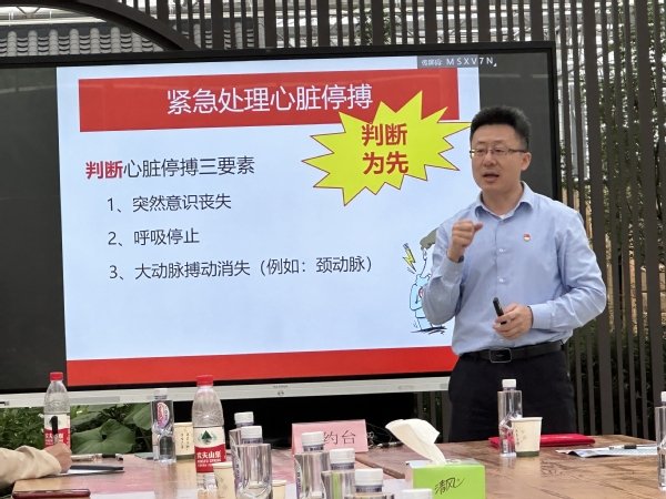 随后中心医院朱仲庚为我们开展了心肺复苏培训,就常见现场急救“黄金4分钟”急救知识、胸外按压、人工呼吸、除颤仪的使用方法等心肺复苏术方法进行了讲解。讲座结束后进行了演示示范,组织大家进行实操练习,帮助大家掌握这一重要急救技能。大家兴致高涨,积极参与练习,不断向讲解老师提出许多相关急救知识,现场学习氛围浓厚。